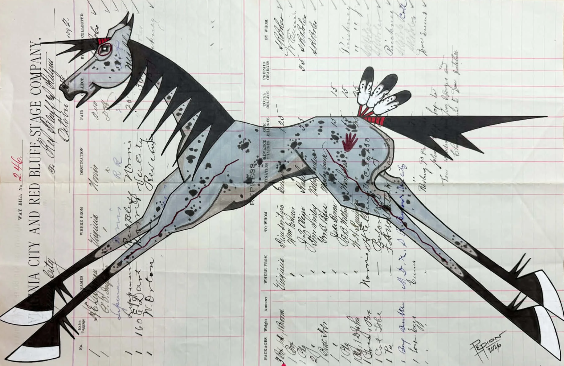 John Isaiah Pepion, Blue Roan, 2026, ink, colour pencil, and acrylic on antique ledger paper.